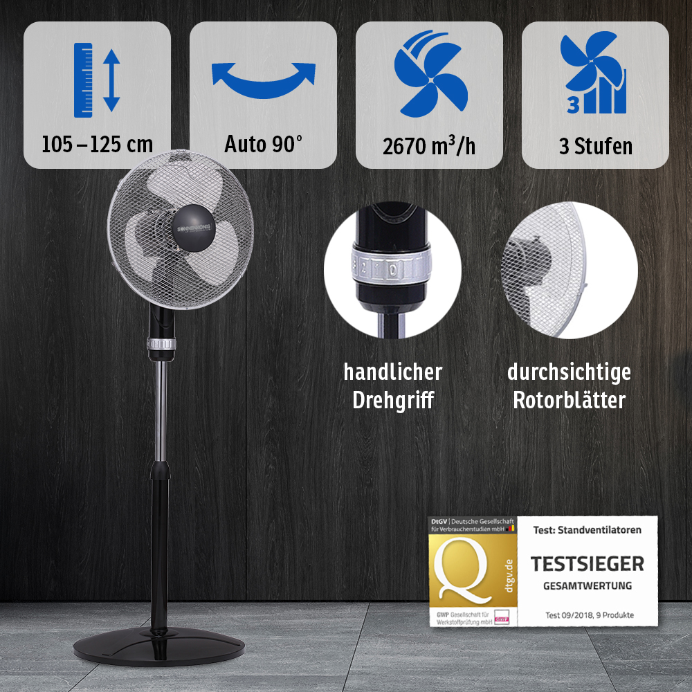 Der elegante BLACK 16“-Standventilator im modernen schwarz-silbernen Design passt in jede Räumlichkeit. Transparente ASP Ventilationsblätter sorgen leise für frische Luft an Ihrem Arbeitsplatz oder in Ihrem Wohnraum. Dank dem handlichen Drehgriff lässt sich der Ventilator in drei Geschwindigkeitsstufen regeln und ist höhenverstellbar. Dank der horizontalen Oszillation verteilt der Ventilator die frische Luft optimal im Raum. Durch Drücken der Taste schwenkt das Gerät seitlich und automatisch von links nach rechts. Zusätzlich kann der vertikale Winkel des Ventilators manuell eingestellt werden. Der Ventilator ist laufruhig und kann in jedem Raum eingesetzt werden.